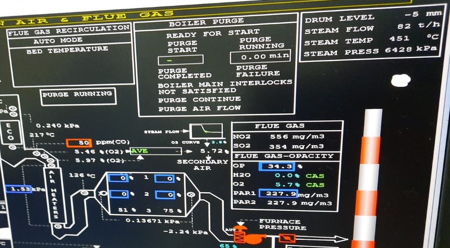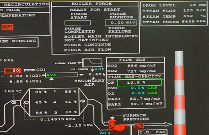 The ESP outlet emission was originally designed at 150mg/Nm3. Before rehabilitation, the running data and stack emission were recorded. The 1st and 2nd fields were already tripped and stack emission was at 227mg/Nm3 with boiler loading of 82 tons/hr, which obviously exceeded the designed value, as shown on CCR display.