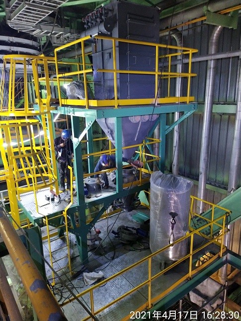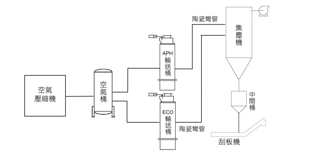由於新設之氣力輸送系統為正壓,為防止在輸灰時大量輸送空氣直接進入鍋爐影響燃燒效率,不能將後爐灰從輸灰桶出料閥直接輸送至鍋爐底灰斗。因此在進入鍋爐底灰斗之前,新設集塵機使底灰以自然降落的方式進入底灰斗,避免影響鍋爐運轉。